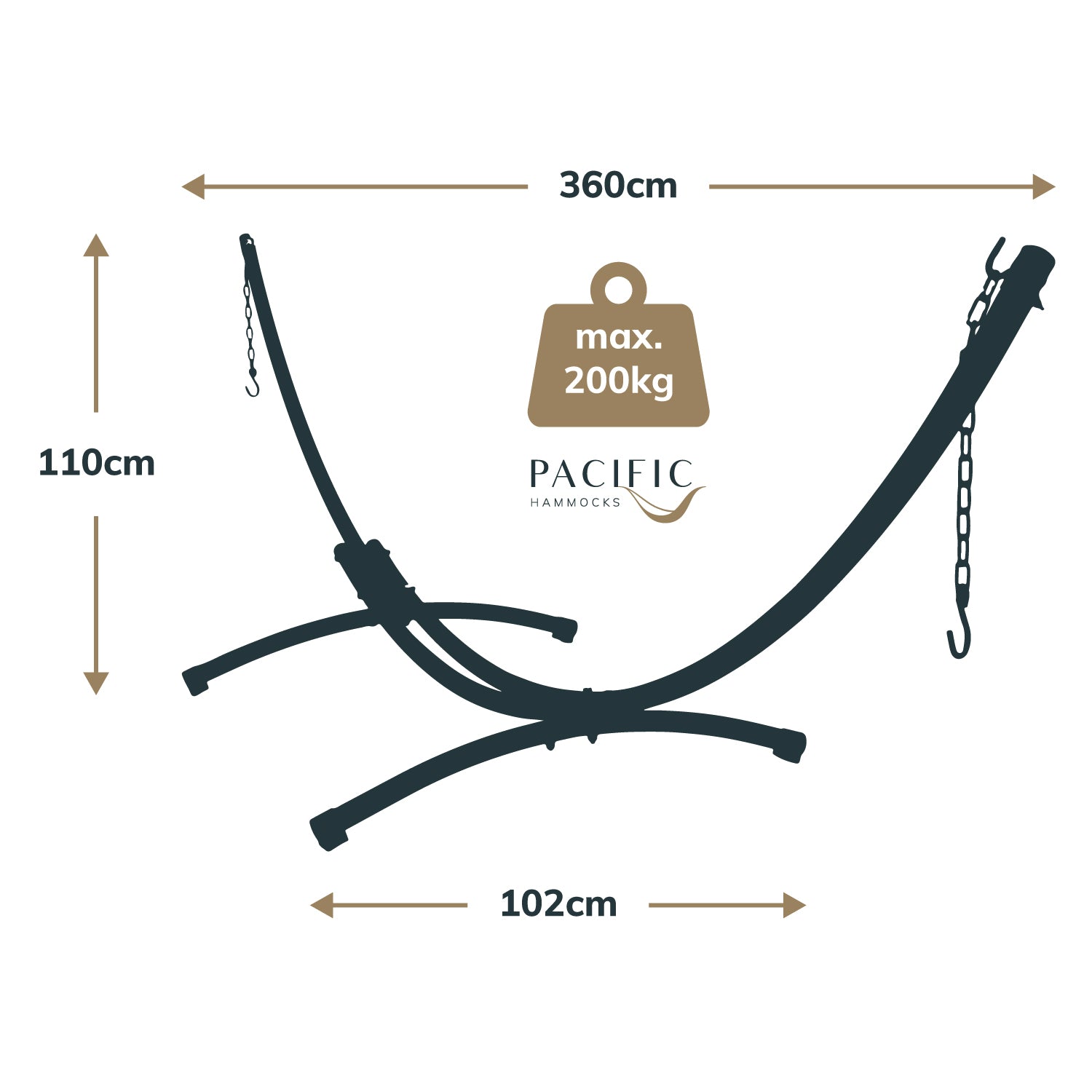 This 12 foot arc stand is suitable for spreader bar hammocks with total lengths of between: 250cm – 340cm (8.2ft to 11.2 ft).