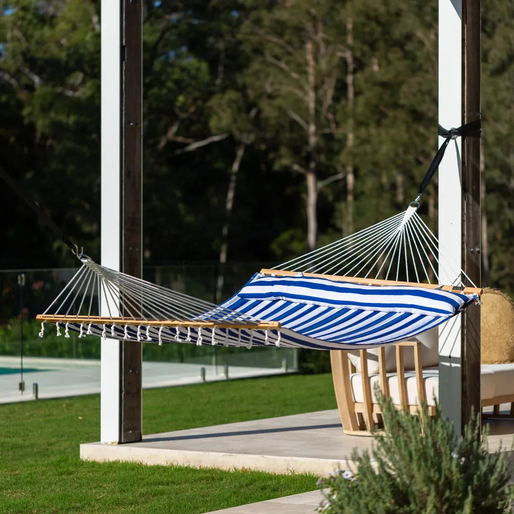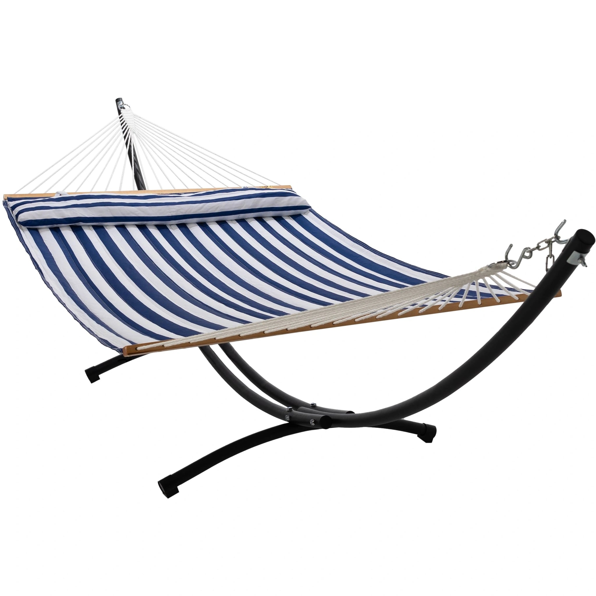 Relax in style with the 12 ft Steel Arc Hammock Stand & King Quilted Hammock in Hamptons Stripe.